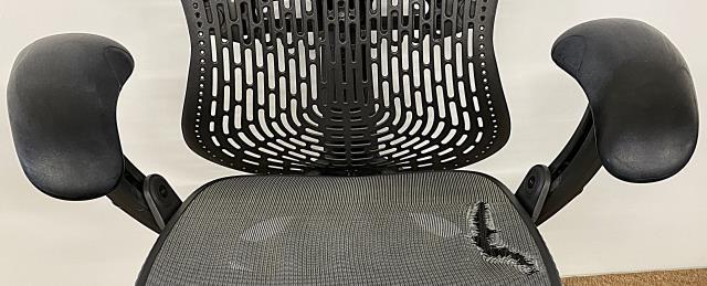 Seat fabric is worn/torn. Light scuffing around base.