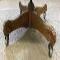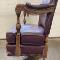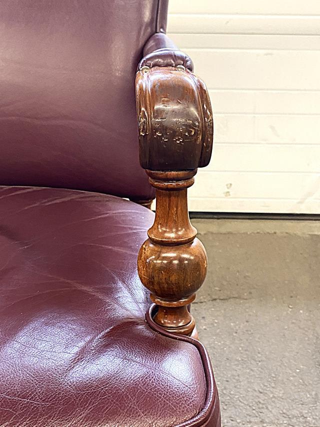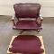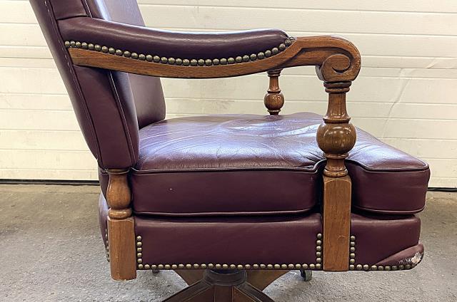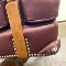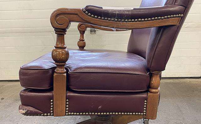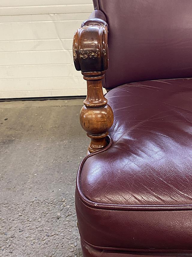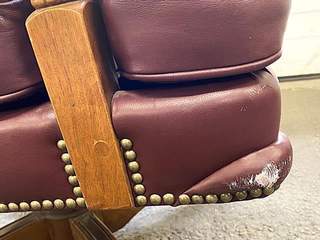 Abrasions in wood, front left and right leather corners are scuffed.